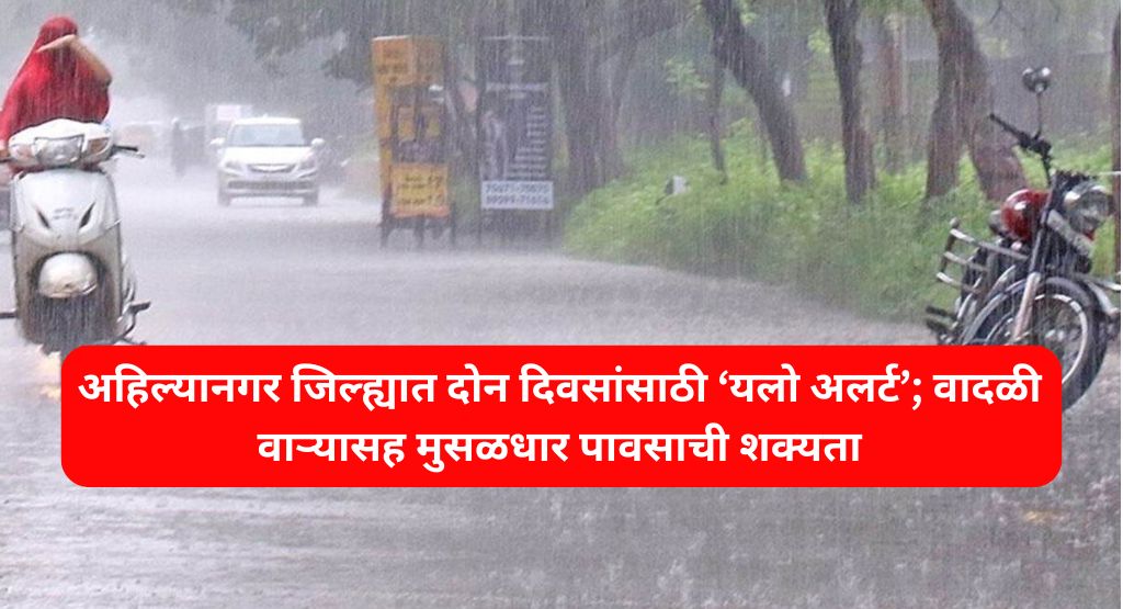 अहिल्यानगर, दि. 25 सप्टेंबर 2025 Ahilyanagar Rain Update भारतीय हवामान विभागाने अहिल्यानगर जिल्ह्यात 26 आणि 28 सप्टेंबर रोजी वादळी वाऱ्यासह मुसळधार पावसाची शक्यता वर्तविली आहे. या पार्श्वभूमीवर जिल्हा प्रशासनाने सतर्कतेचा इशारा देत या दोन दिवसांसाठी ‘यलो अलर्ट’ घोषित केला आहे.