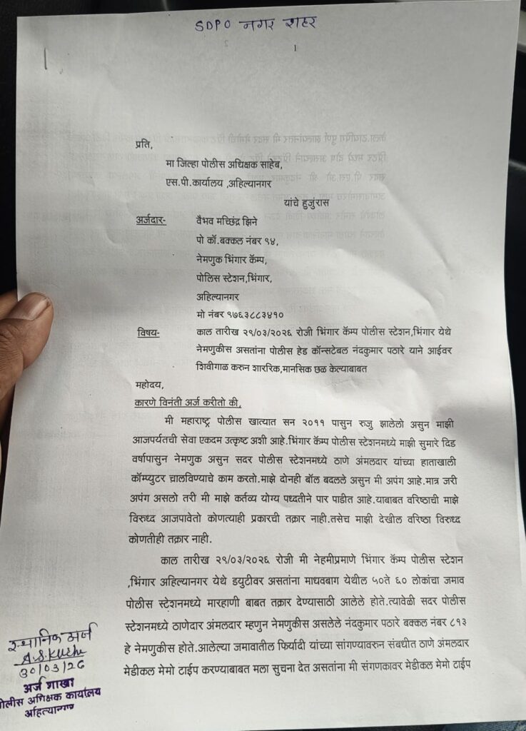 वैभव मच्छिंद्र झिने हे भिंगार कॅम्प पोलीस ठाण्यात पोलीस शिपाई म्हणून कार्यरत आहेत. झिने हे दिव्यांग असून २०११ पासून पोलीस दलात सेवा देत आहेत. त्यांच्या तक्रार अर्जानुसार, २९ मार्च २०२६ रोजी ते पोलीस ठाण्यात स्टेशन डायरी आणि इतर संगणकीय कामे करत होते.