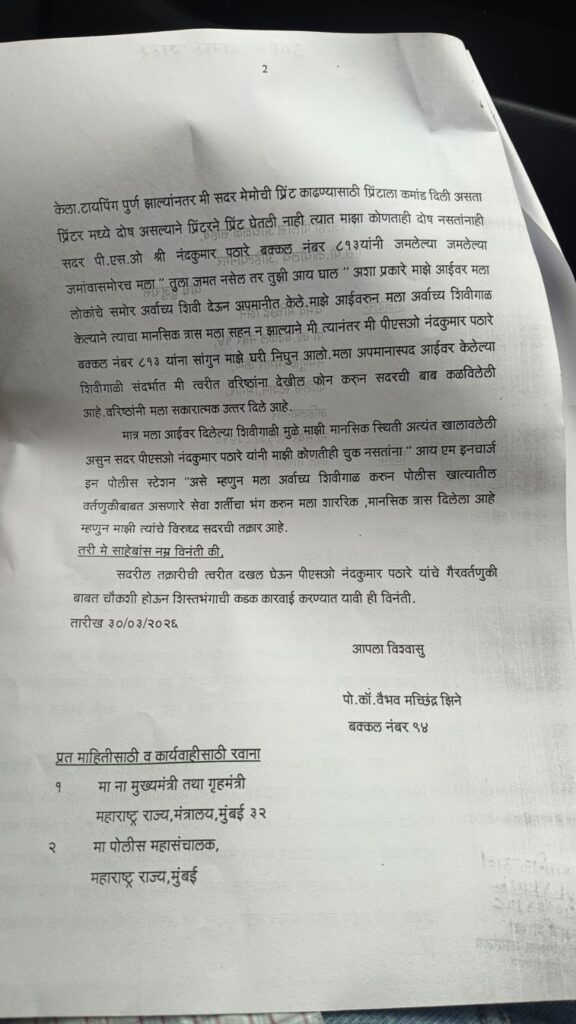 दिव्यांग असतानाही आपण आपली कर्तव्ये चोख बजावत असून आजवर कोणतीही तक्रार नाही, असे झिने यांनी अर्जात म्हटले आहे. मात्र, हवालदार पठारे याने सर्वांसमोर आईवरून दिलेल्या घाणेरड्या शिवीगाळीमुळे आपली मानसिक स्थिती अत्यंत खालावली असून, आपल्याला प्रचंड अपमानित वाटत असल्याचे त्यांनी सांगितले. या घटनेनंतर झिने यांनी तात्काळ वरिष्ठ अधिकाऱ्यांना फोनवरून माहिती दिली आणि रजा घेऊन घरी निघून गेले.